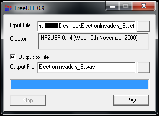 Select your source by clicking the button next to 'Input File' and locate the UEF that you wish to convert. Alternatively, you can drag and drop a UEF file onto the window. If you wish to output the UEF through your computer speakers or sound output then click 'Play'. To convert to a wav file then check the 'Output to File' box and select a target output filename, including the .wav extension, by clicking the button next to 'Output file'. FreeUEF outputs mono 8bit audio at 44100Hz